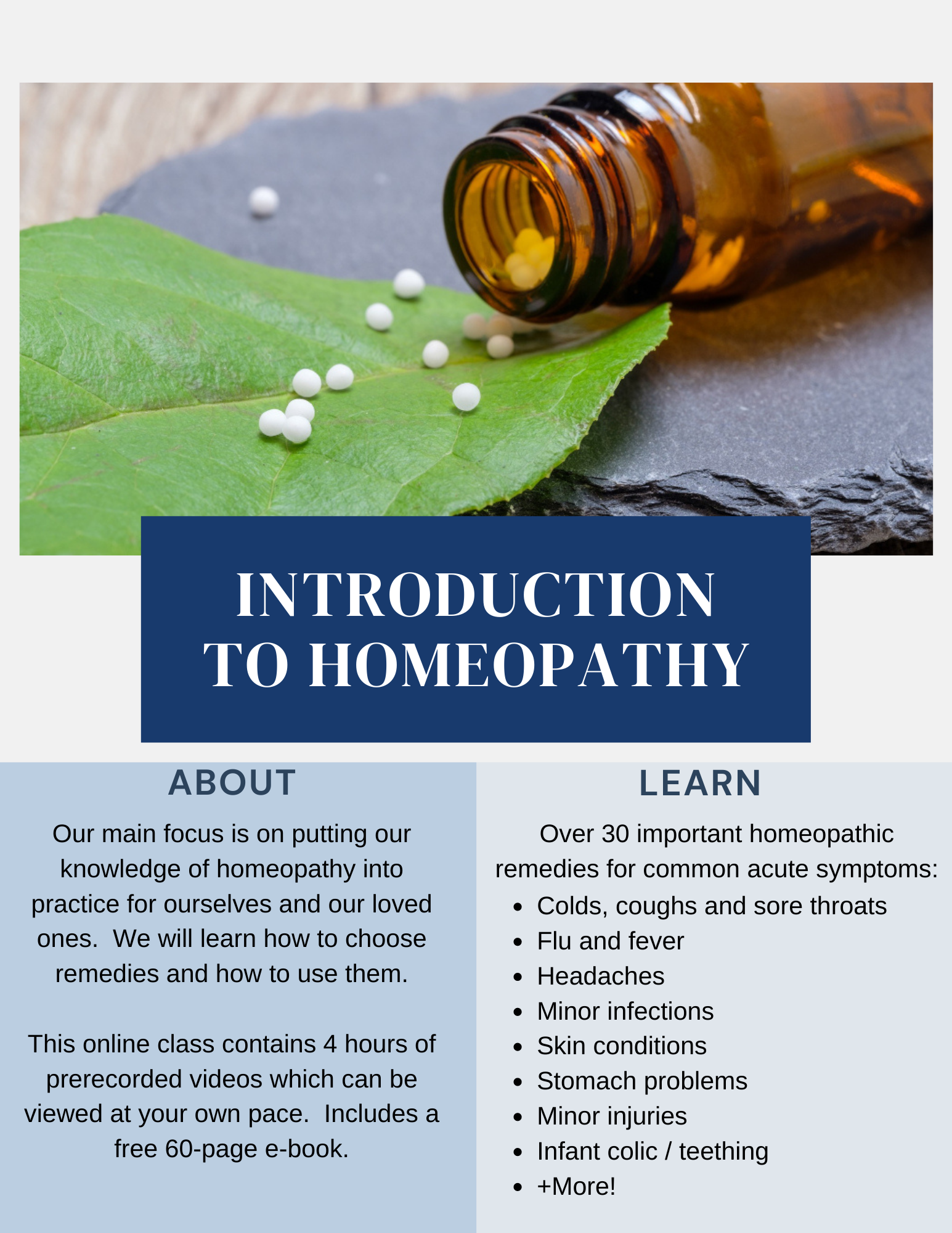 Topics covered in the class include a brief history of homeopathy, basic guidelines for choosing and using a remedy, homeopathic potencies and dosage, tissue salts, emergency care, and discussion about dozens of the most commonly used remedies for home care.